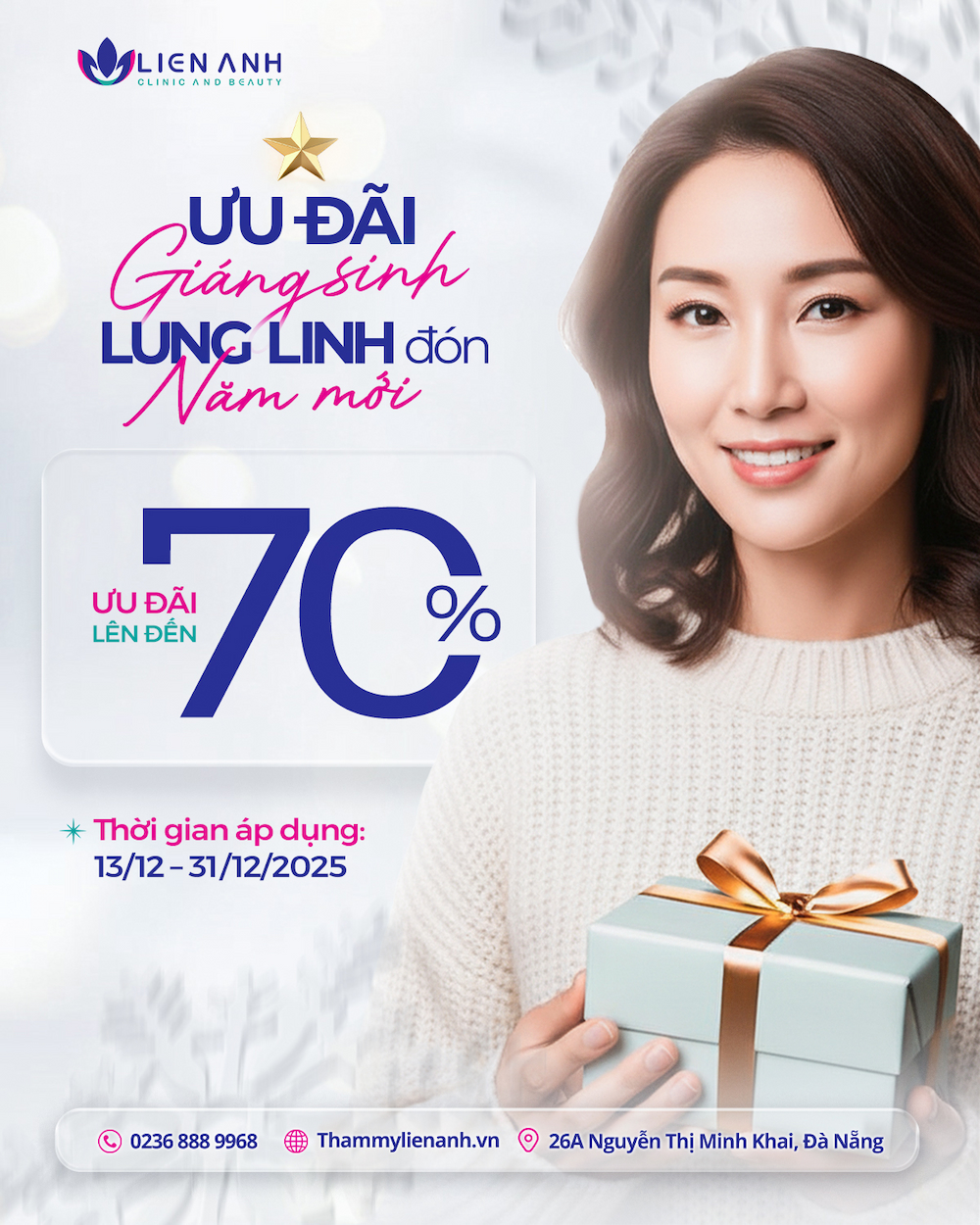 Cuối năm luôn là thời điểm chúng ta muốn chăm sóc bản thân nhiều hơn — đặc biệt là làn da. Nhân dịp Giáng sinh và chào đón năm mới, Liên Anh xin gửi đến Quý Khách hàng chương trình ưu đãi đặc biệt như một lời tri ân chân thành.